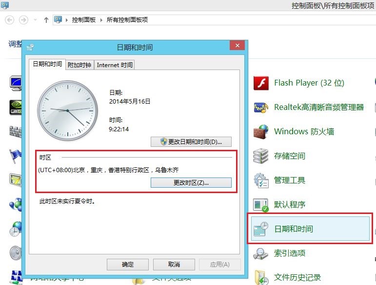 打开控制面板---时间和日期---弹出“时间和日期”对话框,点击“更改时区”按钮,设置为正确的(UT+08:00)北京,重庆,香港特别行政区、乌鲁木齐时区,如图:
