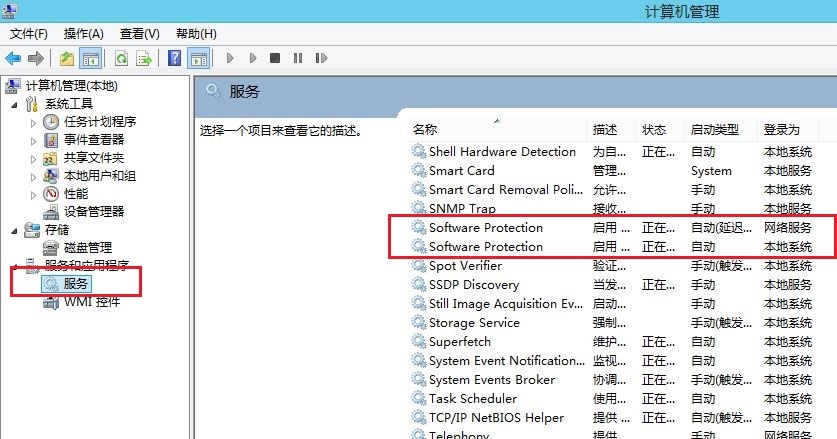 五、系统 software protection 服务未开启,此服务为软件保护服务,是激活和验证Windows需要的,计算机右键---弹出菜单选择“管理”---服务和应用程序---服务,右侧找到 software protection 服务,看此服务是否已开启,如图: